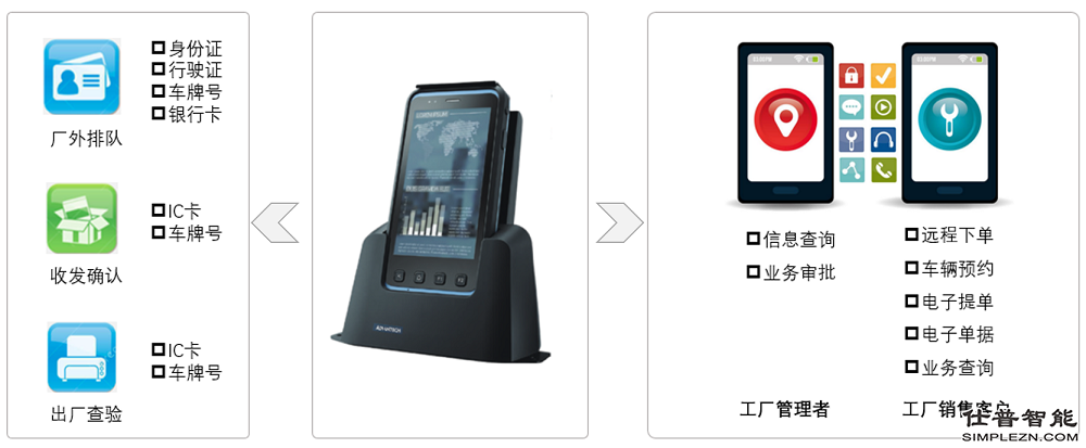 移动数据物流管理终端为适应工厂移动作业而设计,通过4G公网、无线WIFI接入业务管理系统,具有身份证识别、车牌识别、行驶证识别、人脸识别、NFC读卡、二维码扫描、定位导航等功能,通过APP软件可进行信息查验、二次复核、收发确认、路径导航等业务操作。